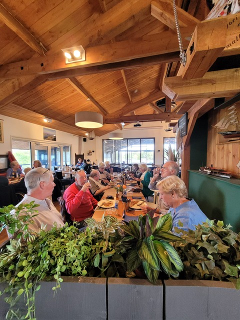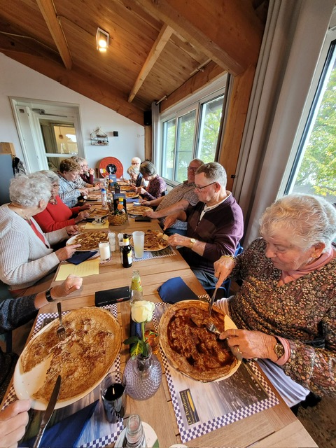 Op 25 september zijn we met een grote groep enthousiaste deelnemers pannenkoeken gaan eten bij Pannenkoekenboerderij de Ponthoeve in Vianen. We zaten aan een lange tafel bij het raam met mooi uitzicht op de Lek met voorbijvarende schepen. Tijdens een drankje werd er gezellig bijgepraat. Er waren een paar nieuwe deelnemers, die zich zo te zien ook goed vermaakt hebben. Iedereen maakt een keuze voor een heerlijke pannenkoek en na korte tijd kwamen deze op tafel. Na verloop van tijd waren de borden leeg en zijn we tevreden weer naar Doorn vertrokken